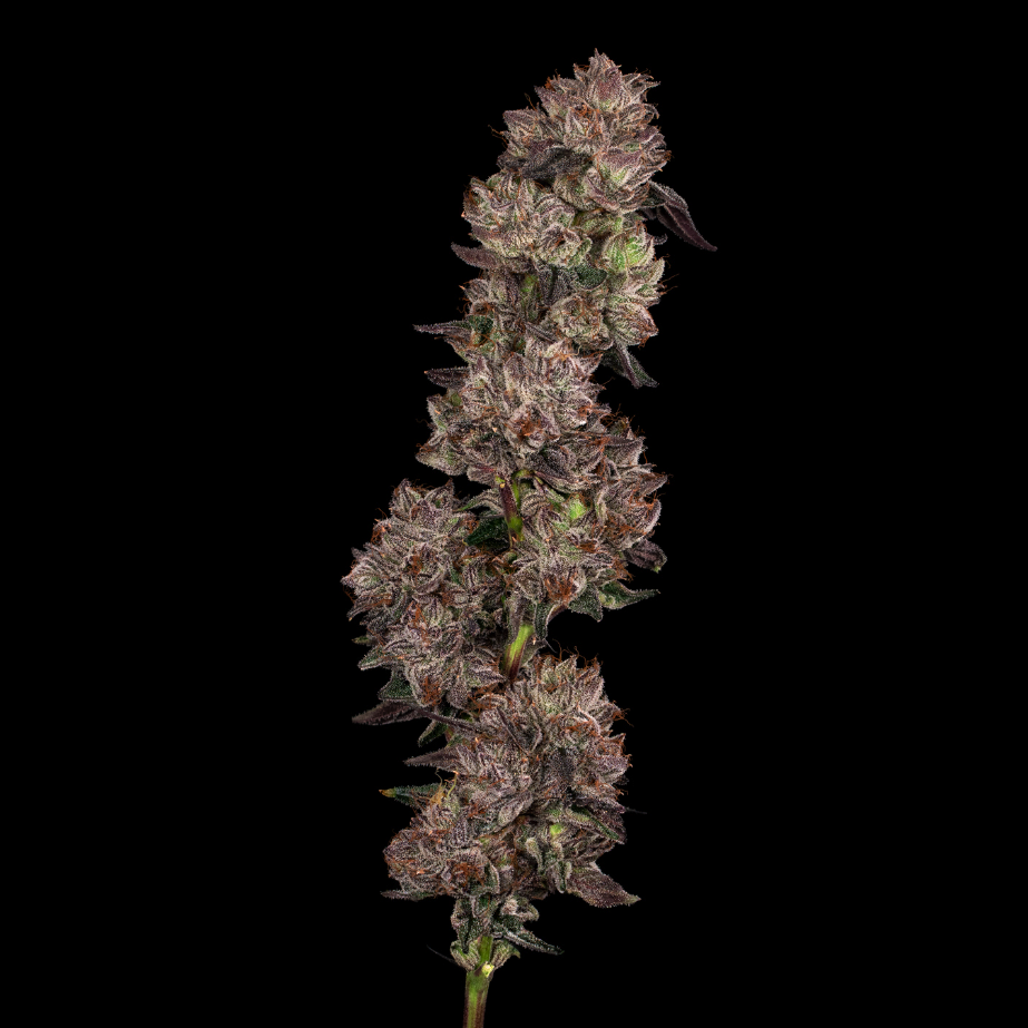 Runtz is an evenly balanced hybrid strain (50% indica/50% sativa) created through a delicious cross of the infamous Zkittlez X Gelato strains. Named for the iconic candy, Runtz brings on a super delicious fruity flavor with tropical citrus and sour berries galore. The aroma is very similar, although with a sharp spicy pineapple effect that turns slightly pungent as the sticky little nugs are broken apart and burned. The Runtz high comes roaring in a few minutes after your final toke, first hitting your head with a calming lift before spreading its tingly tendrils throughout the rest of your body. As the Runtz high expands, you’ll begin to feel a deeply calming effect spread through your limbs, leaving you totally sedated and couch-locked, immovable for hours and hours on end before you finally fall into a deep and peaceful sleep. Thanks to these effects and its super high 19-29% average THC level, Runtz is often said to be perfect for treating conditions such as insomnia, chronic pain, appetite loss or nausea and chronic stress or anxiety. This bud has dense grape-shaped olive green nugs with thin orange hairs, dark purple undertones and a coating of frosty tiny white purple-tinted crystal trichomes.